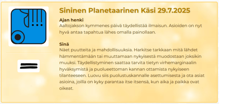 "Kalenteri on ollut kuin lempeä opas matkallani – se auttaa ymmärtämään päiviä aivan uudella tavalla. En enää aloita päivääni ilman pientä vilkausta energialaatuihin – suosittelen lämpimästi!"